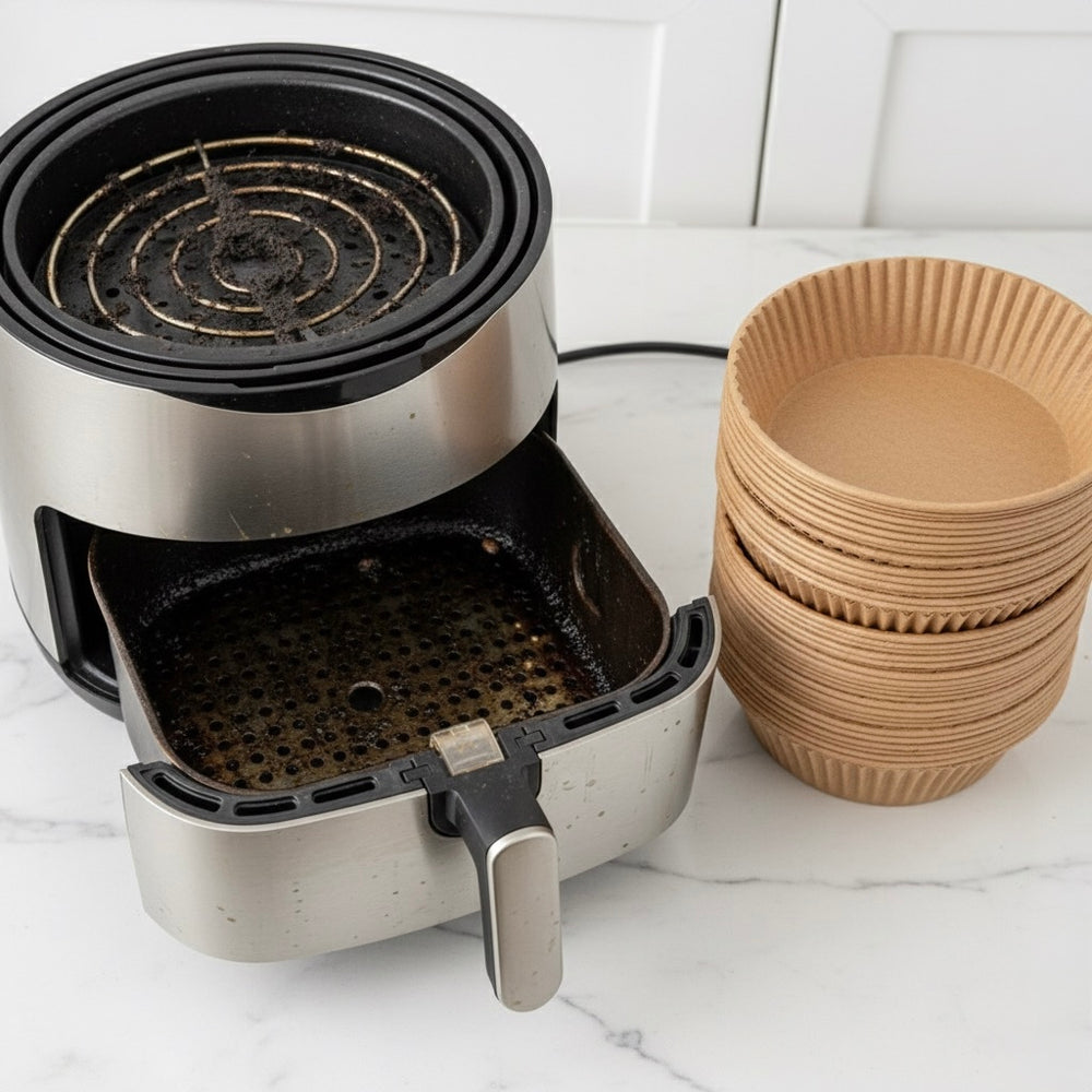 Diseño tipo cuenco con bordes altos: evita derrames y mantiene la grasa dentro del papel, protegiendo la freidora.
